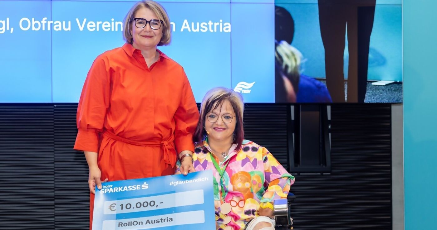 Auch der Verein RollOn Austria, welcher es sich zum Ziel gesetzt hat, die Anliegen und Interessen körper- und mehrfachbehinderter Menschen zu vertreten, hatte an diesem Abend Grund zur Freude. Die Obfrau des Vereins, Marianne Hengl, durfte einen Spendenscheck in der Höhe von 10.000 Euro von Karin Svoboda, Vorständin der Tiroler Sparkasse, entgegennehmen.