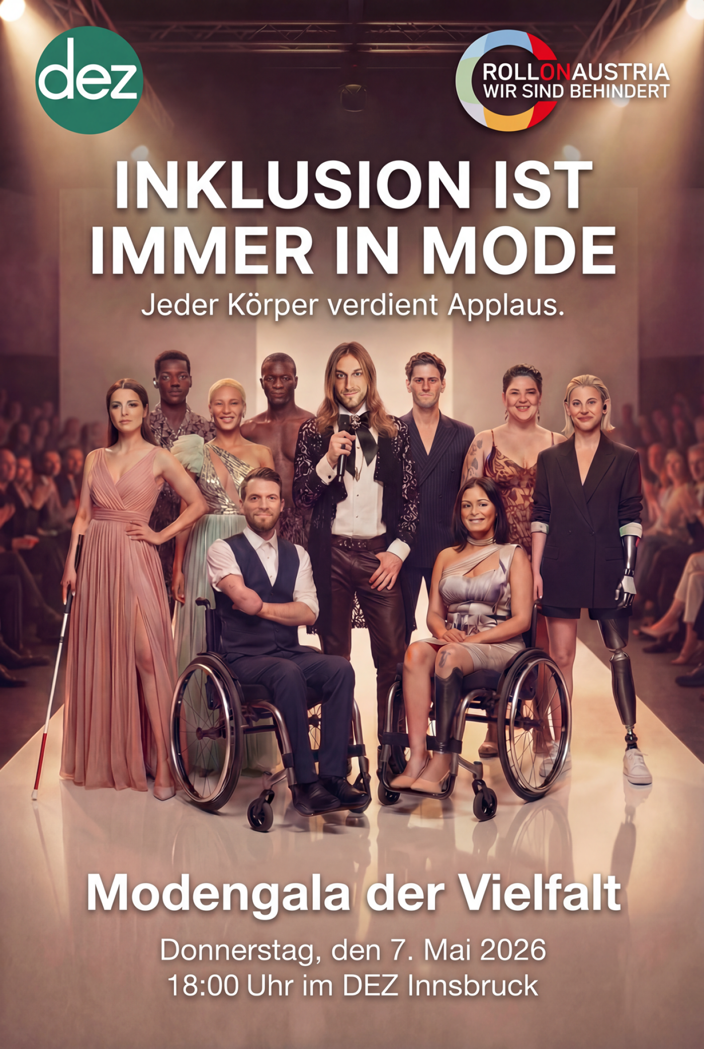Models mit Behinderung, Topmodels und bekannte Gesichter werden gemeinsam den Laufsteg erobern – selbstbewusst, elegant, mutig und voller Ausstrahlung. Jeder Schritt ist dabei ein Statement: für Respekt, für Vielfalt, für echte Schönheit.